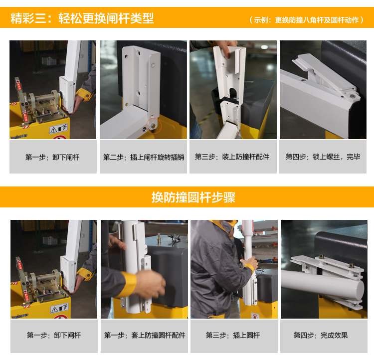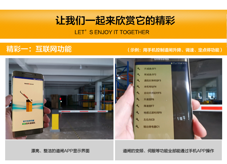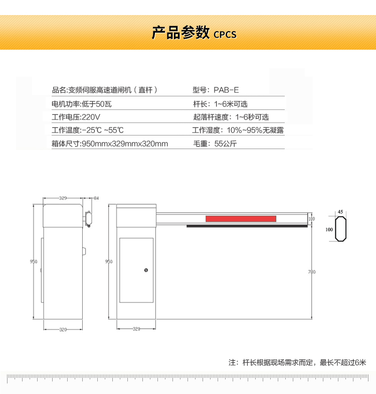 PAB-E型道閘機是公司最近批量生產的新品道閘機,此閘機有多個亮點:一是閘機左右向隨便換;二是更換閘桿類型無需另購道閘機;三是伺服功能,自行調節閘桿平穩度,減少抖動;四是故障自檢功能,大大提高故障解決速度;五是互聯網功能,直接用手機APP,控制閘機的升降,調速,定點停等功能。。。